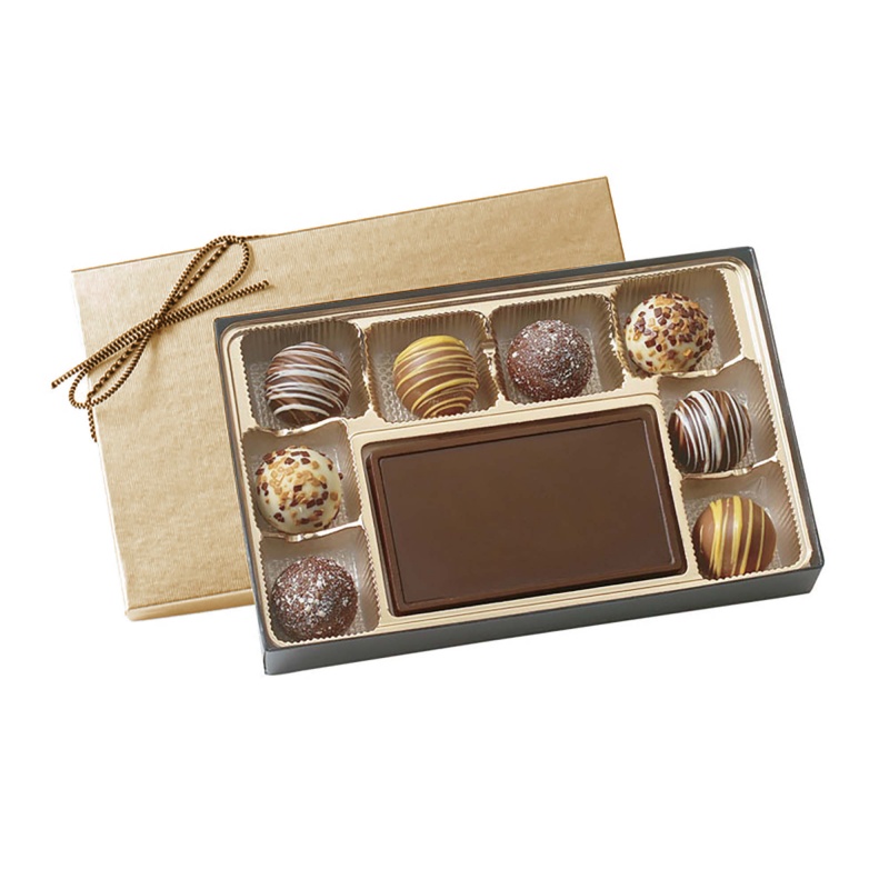 Thank each customer for their continued business during appreciation events or holidays with this sweet treat! The decadent flavor filled truffles sit in a checkered pattern inside this elegant metallic gift box with matching stretch bow. Packed in your choice of silver, gold, or white box with matching ribbon. Box is filled with 8 assorted truffles (4 flavors) surrunding a chocolate molded piece .Imprint the box with your foil stamped logo or your logo molded in creamy milk or dark chocolate. Also makes a superb amenity for hotels, spas and upscale boutiques.