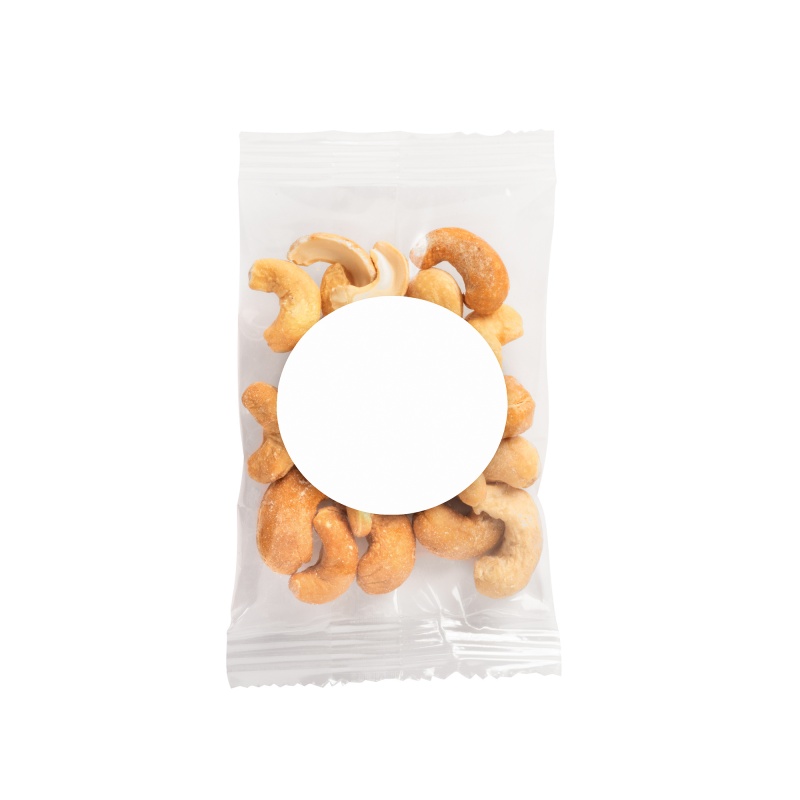 1oz. Jumbo Cashews Goody Bag. Perfect for parades, trade shows or any event where you want to give an inexpensive, colorful and delicious treat. Direct imprint bag dimensions: 4.929" x 2.5". Labeled bag dimensions: 3" x 4". Non melt product.