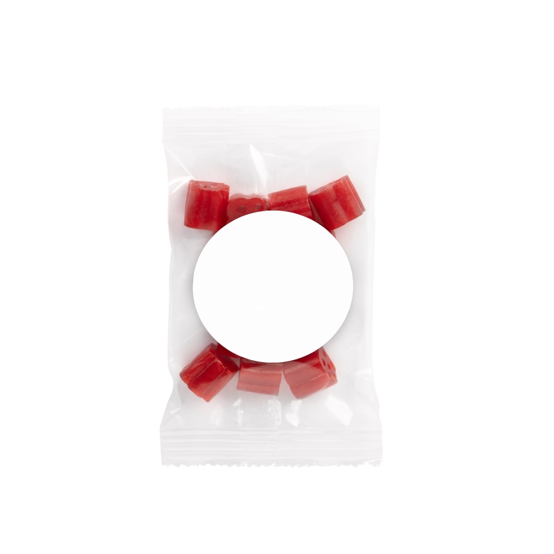 This 1 oz. cherry bites goody bag is the perfect promotional handout for parades, tradeshows or any event that would benefit from this inexpensive, colorful and delicious treat! Featuring a 4.929" x 2.5" direct imprint area with a 3" x 4" labeled area, this customizable treat bag can be imprinted using a 1-4 spot color direct imprint or a 1-4 color process label! Customize this non-melt product for your next event.