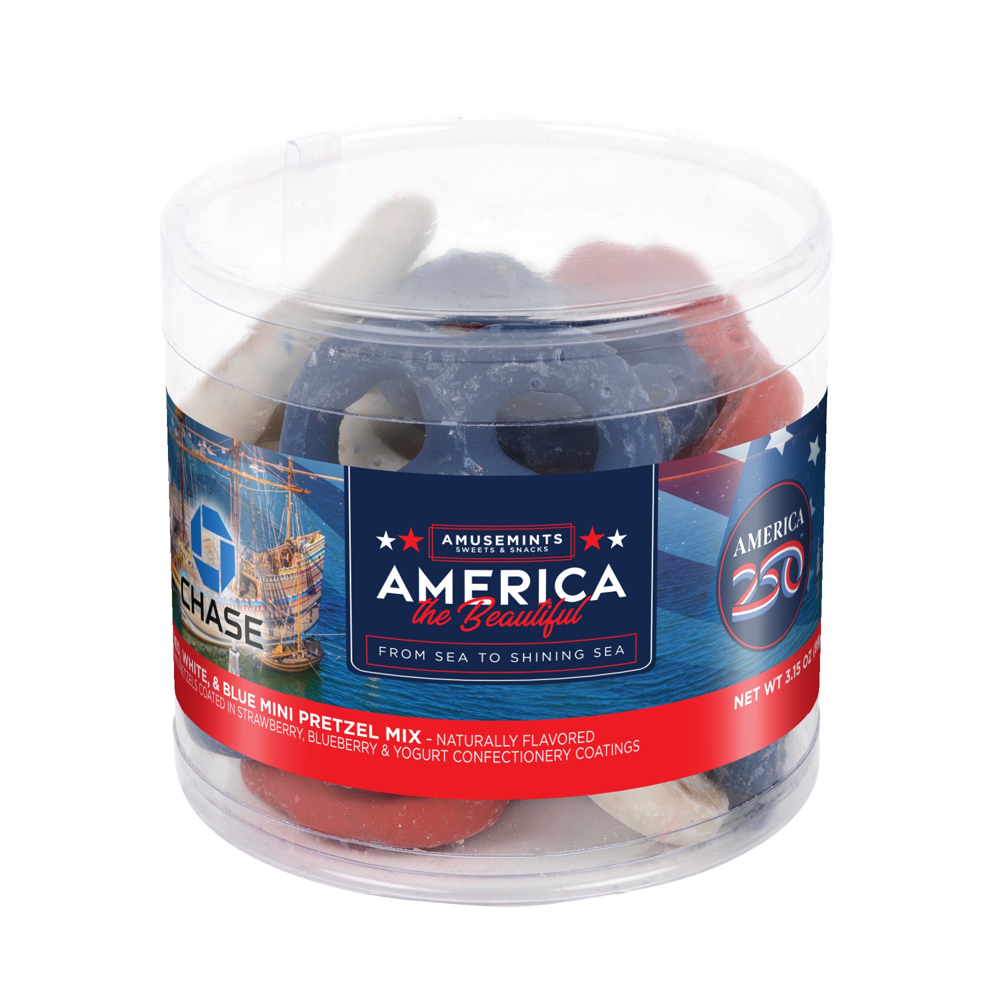 - 3.15 oz Red, White and Blue Chocolatey coated Mini Pretzels.