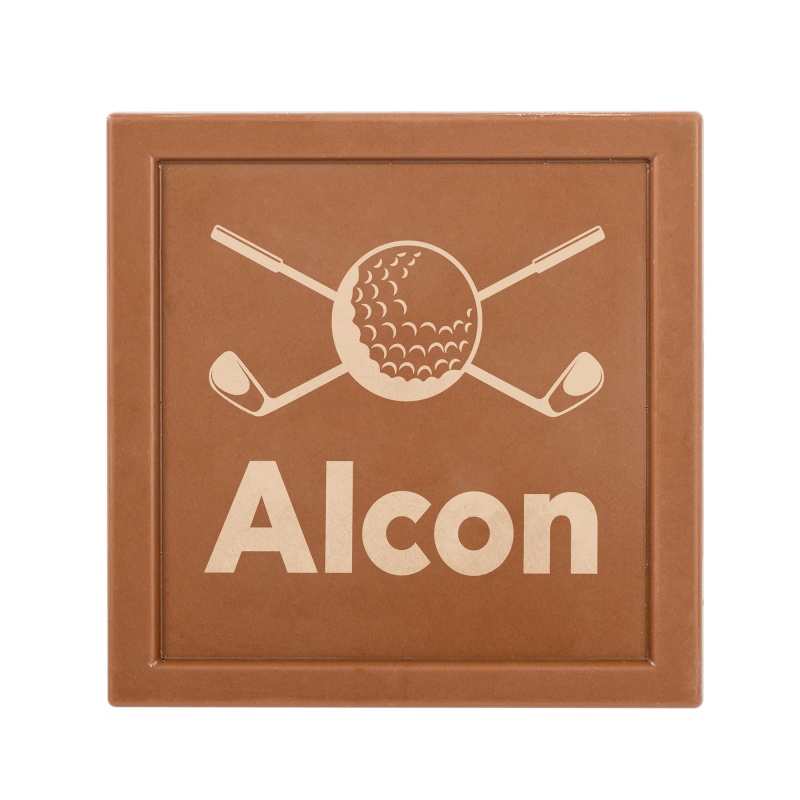Stock Golf Art with a Customized premium Milk Chocolate bar with your own imprint or message lasered directly onto the chocolate and chocolate breakaway bar in either milk or dark chocolate. Packaged in a customizable full color window box.