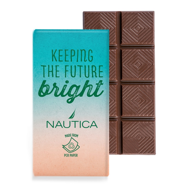 80% post Consumer Recycled Paperboard wrap with a 3oz customizable chocolate bar. Available in Milk or Dark Chocolate. Made from PCR Paper.
