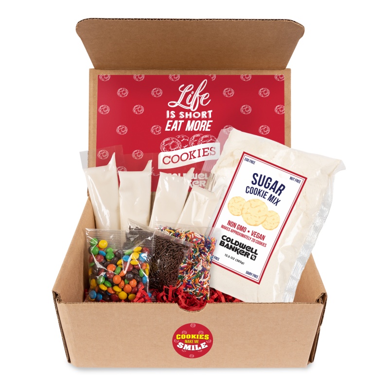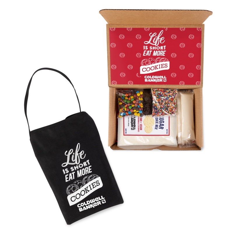 This amazing do it yourself cookie kit is the perfect experiential kit this season! Features a 13.5 oz bag of Fresh Beginnings® sugar cookie mix (makes approx 20 cookies). 4 - 2 oz vanilla icing packets, 1.5 oz bag of rainbow sprinkles, 1.5 oz bag of chocolate sprinkles, 1.5oz bag of mini M&M's®. Also includes an apron featuring the slogan "Life is Short, Eat More Cookies" and your logo. All come packaged in a stock mailer gift box stating "We Are A Batch Made in Heaven!" Customize inner box label with our stock design and your logo or completely customize label.
